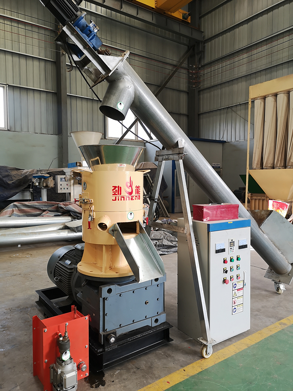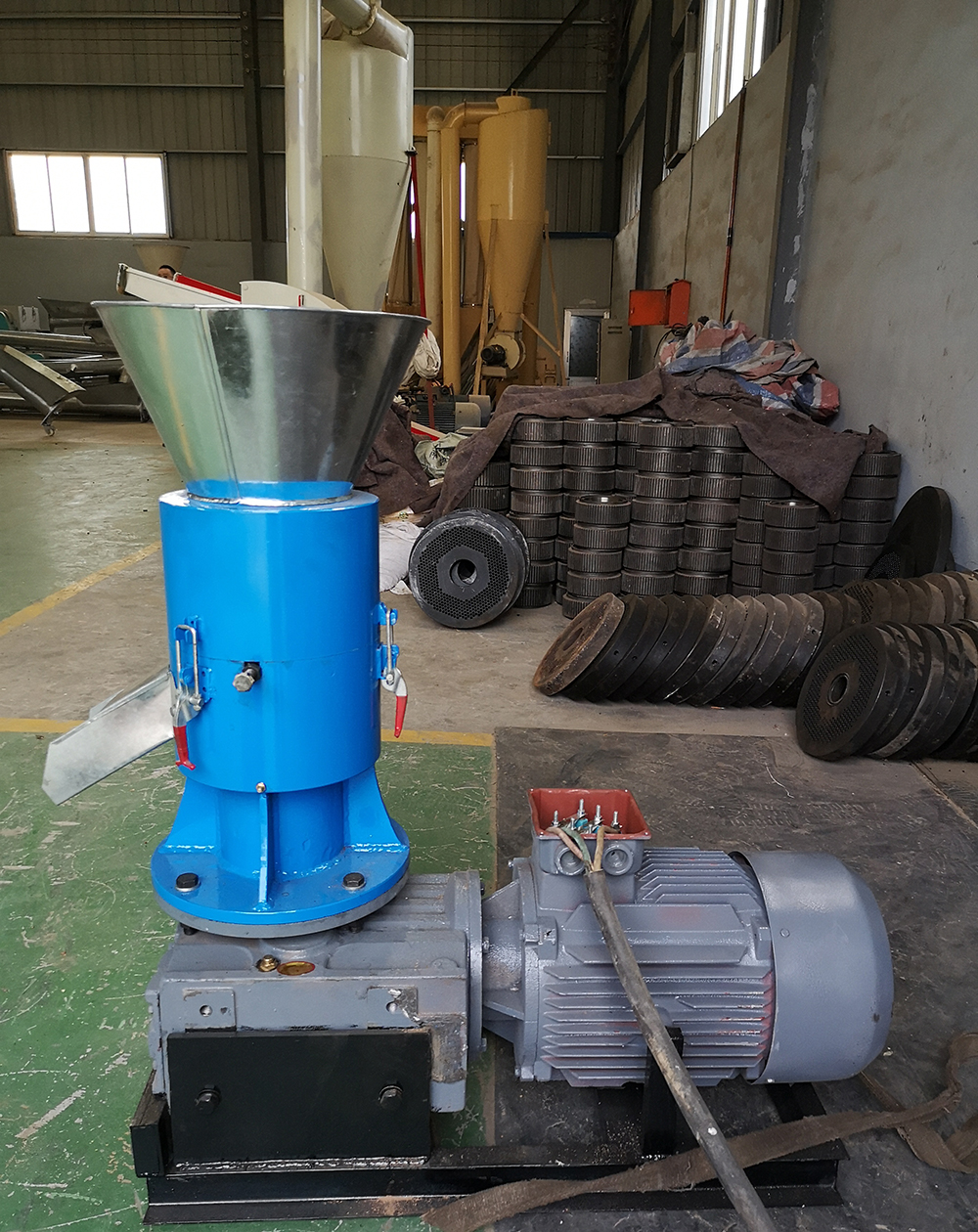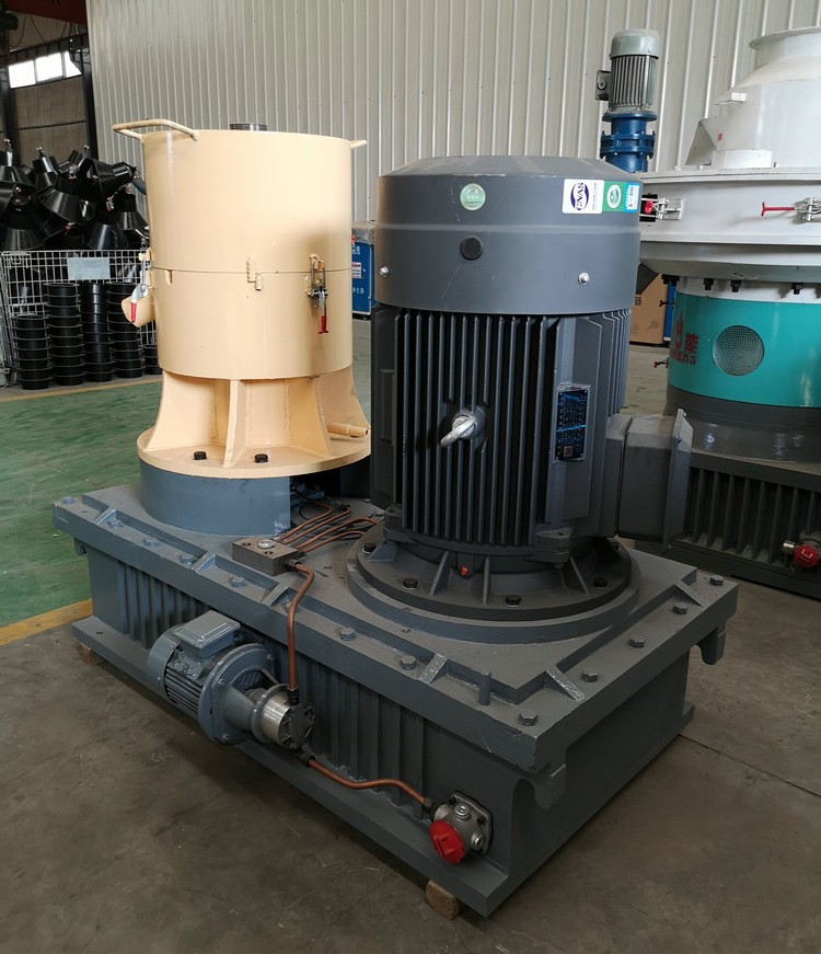 制粒原理電機通過減速機變速后帶動機器主軸轉動,主軸和壓輥軸連接,模具靜止,壓輥和模具物料摩擦轉動,將物料通過模具壓出,切刀把壓出物料切斷后落入甩料盤,甩至機器出料斗,制粒完成。