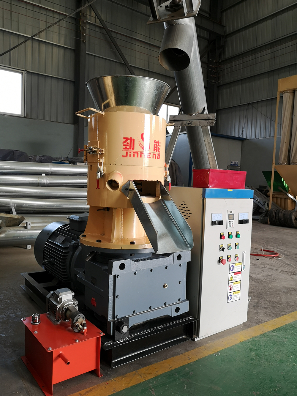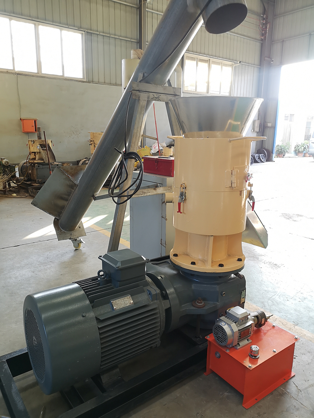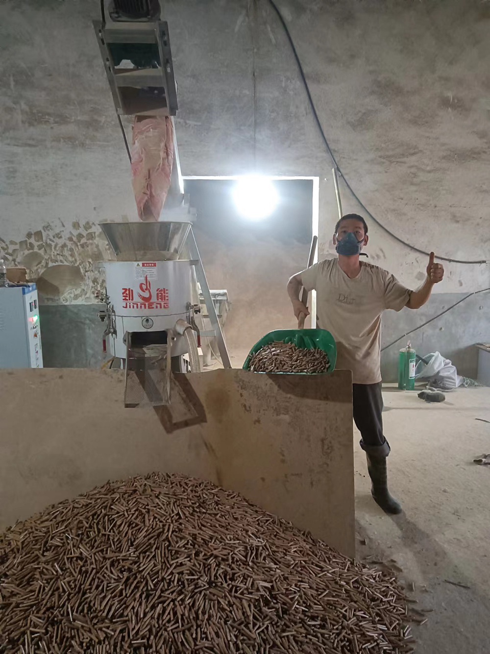 制粒原理電機通過減速機變速后帶動機器主軸轉動,主軸和壓輥軸連接,模具靜止,壓輥和模具物料摩擦轉動,將物料通過模具壓出,切刀把壓出物料切斷后落入甩料盤,甩至機器出料斗,制粒完成。